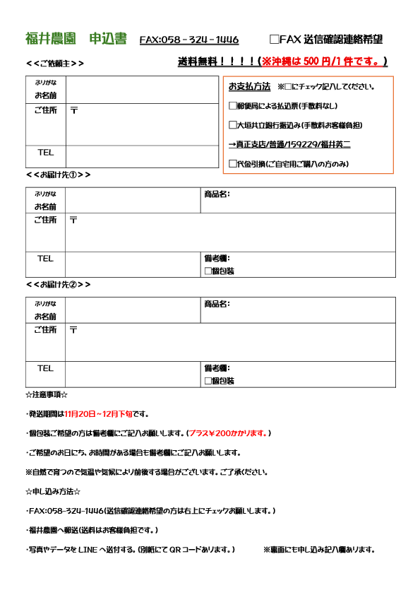 ↓ ↓ ↓送り主様、送り先様の・お名前・住所・電話番号・柿のサイズ・指定日、指定時間、希望時期を記載よろしくお願いします。